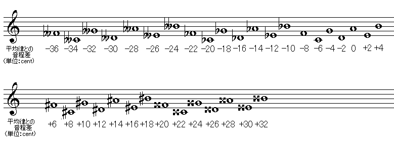 一般的に紹介されるピタゴラス音律と異なるのは、普通は12種類の音程しか示されず、たとえばAbとG#のような音程は異名同音として同じものと扱われてしまうのに対し、ここでは全て異なる音程として扱っているということです。全ての音程が「異名異音」となっているわけです。ダブルフラットやダブルシャープまで含めれば実に35種類もの音程が1オクターブの中に存在しうる、というわけなのです。「拡張ピタゴラス音律」という名前は、これら全てを異なる音程として扱い、かつその一つ一つがピタゴラス音律の特徴である純正な完全五度(完全四度)のみから成るということに由来している。